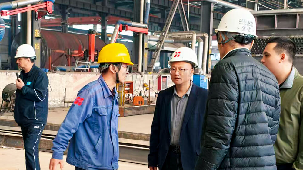 Recently, a delegation of local boiler agents from Kazakhstan visited Henan Huatai Petrochemical Equipment Co., Ltd. (hereinafter referred to as “Huatai”) for inspection and exchange. They conducted an on-site visit to assess the company’s research, development, and production capabilities in fuel and gas hot water boilers, seeking new opportunities for cooperation and exploring new developments in the industry. Manager Jiao from the International Business Department, Engineer Cao from the Technology Department, and Director Ma from the Production Department of Huatai accompanied the delegation throughout the visit, demonstrating the company’s profound expertise in the boiler field through professional explanations and a pragmatic attitude.